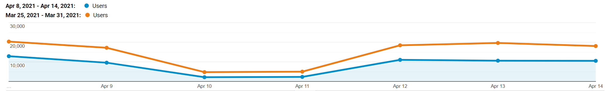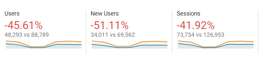… and the massive drop in visitors numbers (as recorded in Google Analytics) is only marginally better, at -45% :